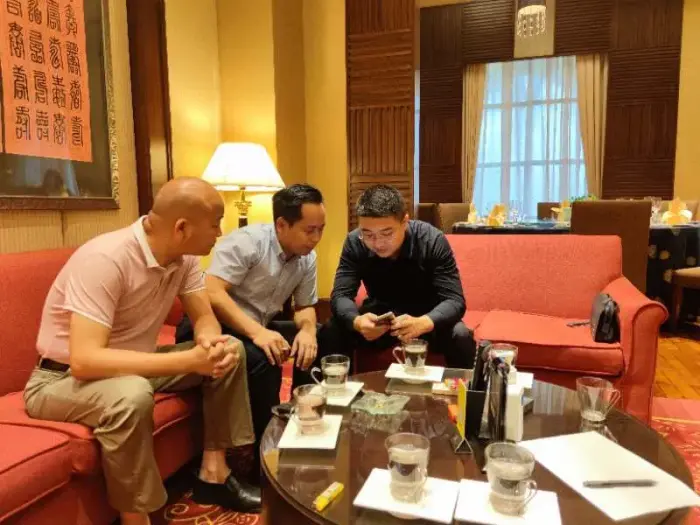 (迪尔公司董事长张木子(中)、总经理刘仕健与粉象董事长康一成(右)探讨云智谷的建设。)